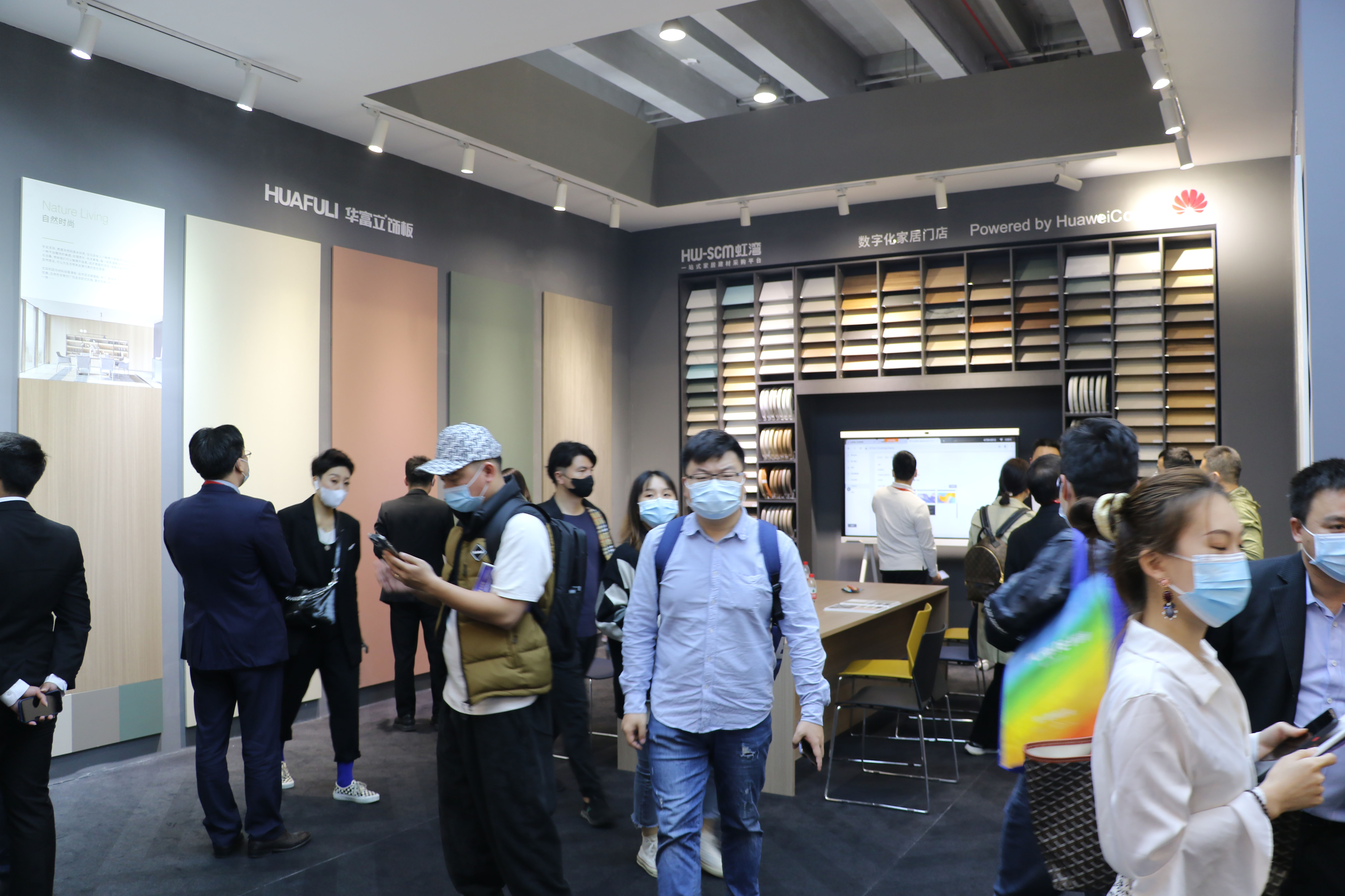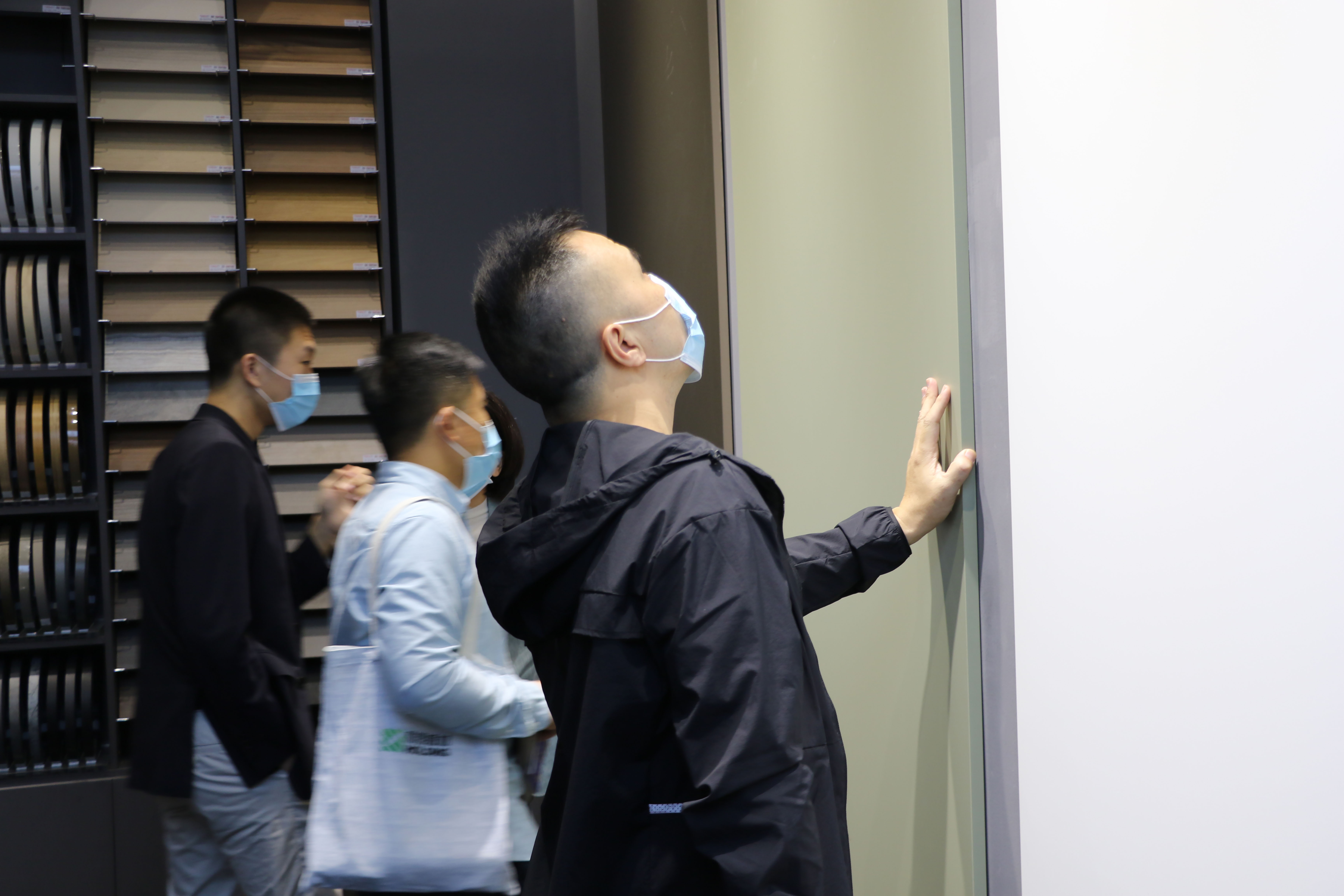 华立展位现场,涵盖了来自定制家居门店、家具厂、终端客户群体、家居设计人员以及同行材料商等,现场客户络绎不绝,沉浸着享受华立产品带来的全新视觉盛宴。